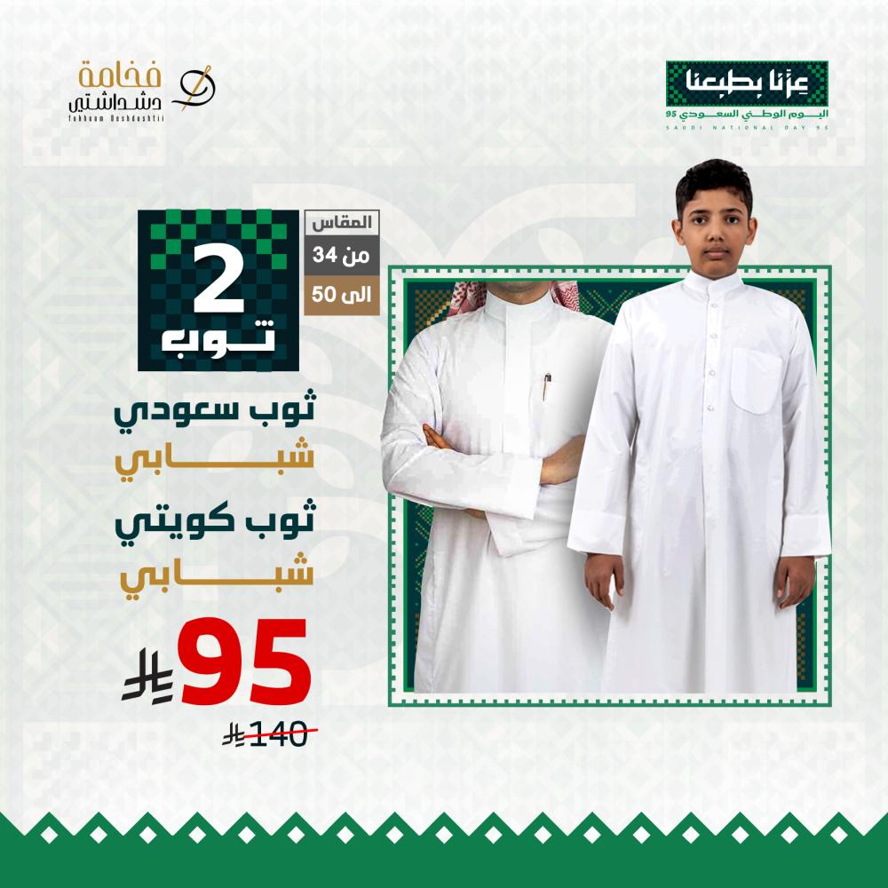 احصل على ثوبين شبابي بتفصيل أنيق: واحد سعودي والثاني كويتي، في عرض يجمع بين التنوع والأصالة، وبتفاصيل تليق بمناسبة اليوم الوطني